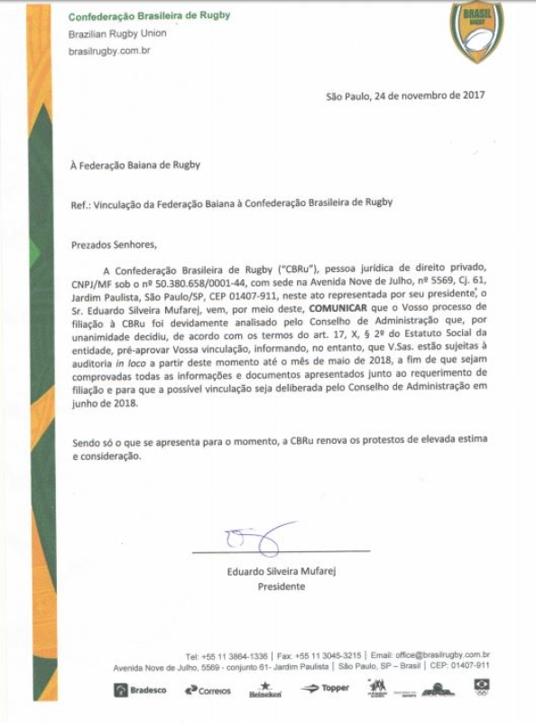 A FRB recebeu hoje (27/11) o ofício que pré-aprova sua entrada para a CBRu, alertando para que sua filiação seja aprovada em definitivo, em junho 2018, será feito auditoria in loco das informações fornecidas àquela entidade, quando solicitado sua filiação.